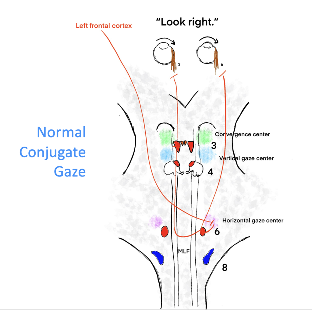 In this case scenario, the difficulty begins with attempted right lateral gaze. The normal pathway is shown above. The cortex (frontal eye field) directs the opposite (right) horizontal gaze center to look right. The yoked movement of the two eyes is then orchestrated. The right abducens nucleus is stimulated to contract the right lateral rectus, while the stimulus is sent rostrally along the opposite (left) MLF (medial longitudianl fasciculus) to the left oculomotor nuclues in order to contract the left medial rectus in sync with the right lateral rectus. The cranial nerve nuclei III, IV, and VI are numbered and shown as the paired red-filled shapes. Click continue for more.