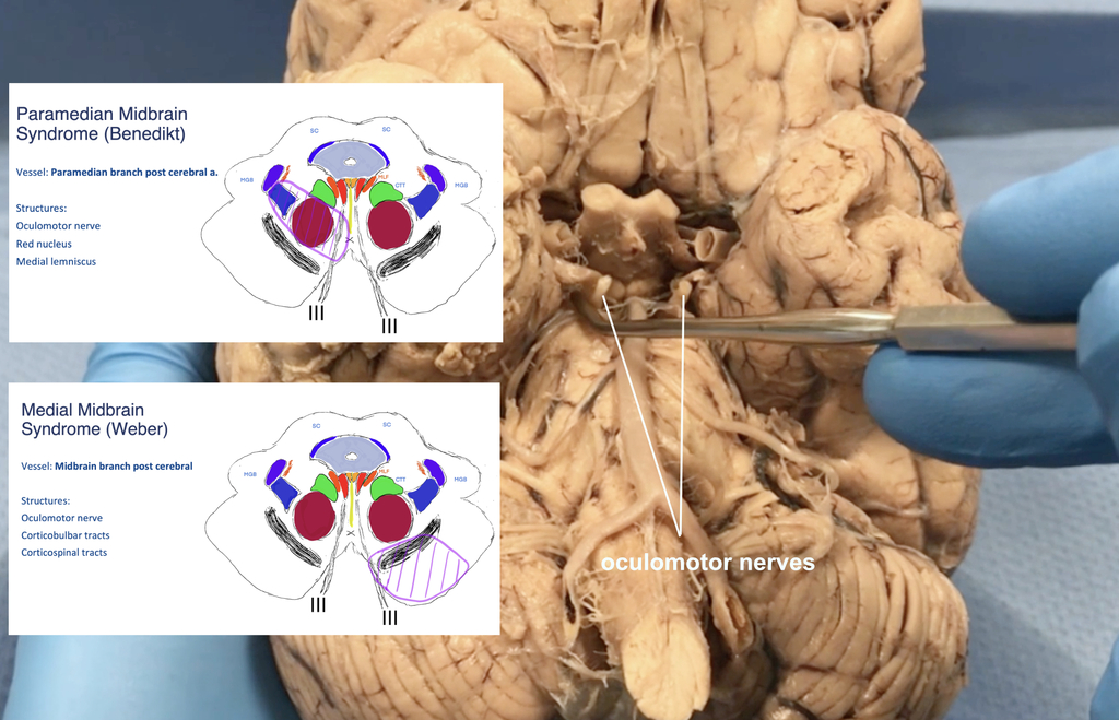 Yes, an occlusion of a branch of the posterior cerebral artery can injure CN III, the oculomotor nerve. The paramedian and medial midbrains syndromes are caused by such occlusions. CN III can also be injured by compression from a herniation or an aneurysm. Recall if the H-test in this case is consistent with an oculomotor nerve palsy? Which of the following is the colloquial term for malpostion of the eye due to a oculomotor nerve palsy?
